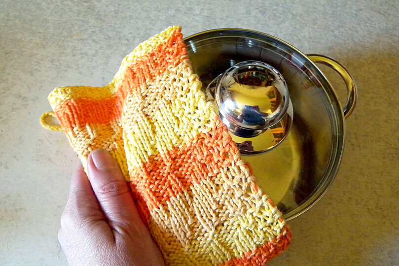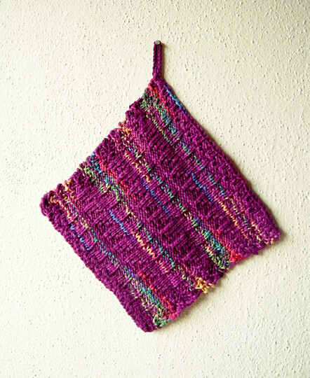 A colorful potholder made in aran weight cotton yarn. It is worked in a pretty textured pattern on small size needles to create a dense and sturdy fabric that will protect your hands from the heat of the oven.