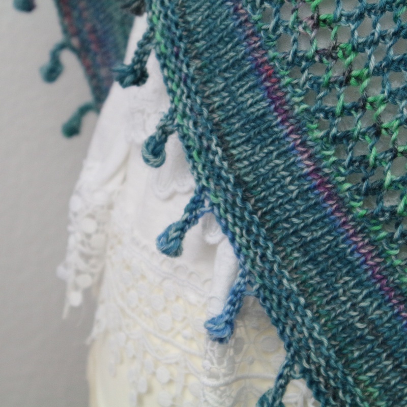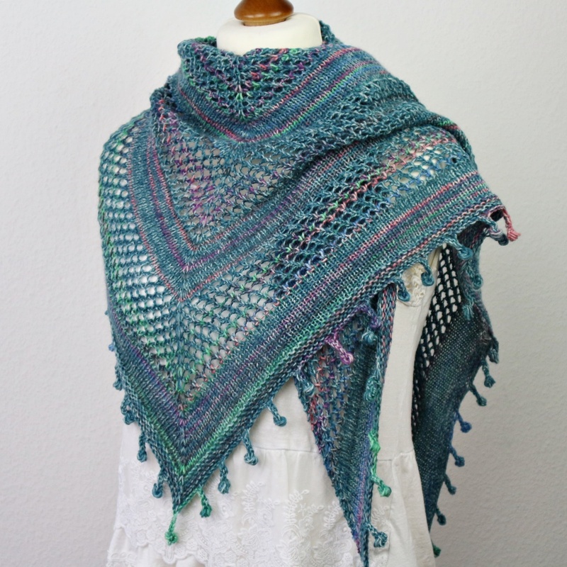 The Fringes shawl is a relaxing and versatile knitting project featuring a simple yet elegant texture. This symmetrical triangle shawl combines sections of stockinette stitch with an airy eyelet pattern, creating a light and balanced design.