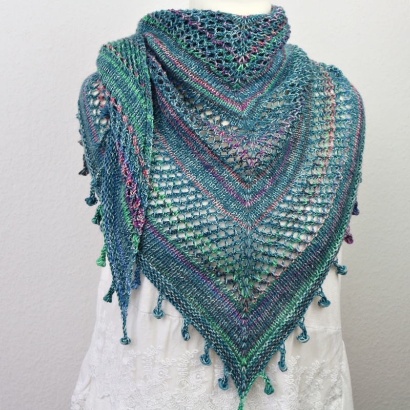 The Fringes shawl is a relaxing and versatile knitting project featuring a simple yet elegant texture. This symmetrical triangle shawl combines sections of stockinette stitch with an airy eyelet pattern, creating a light and balanced design.