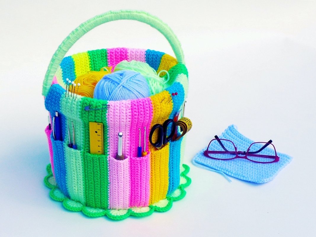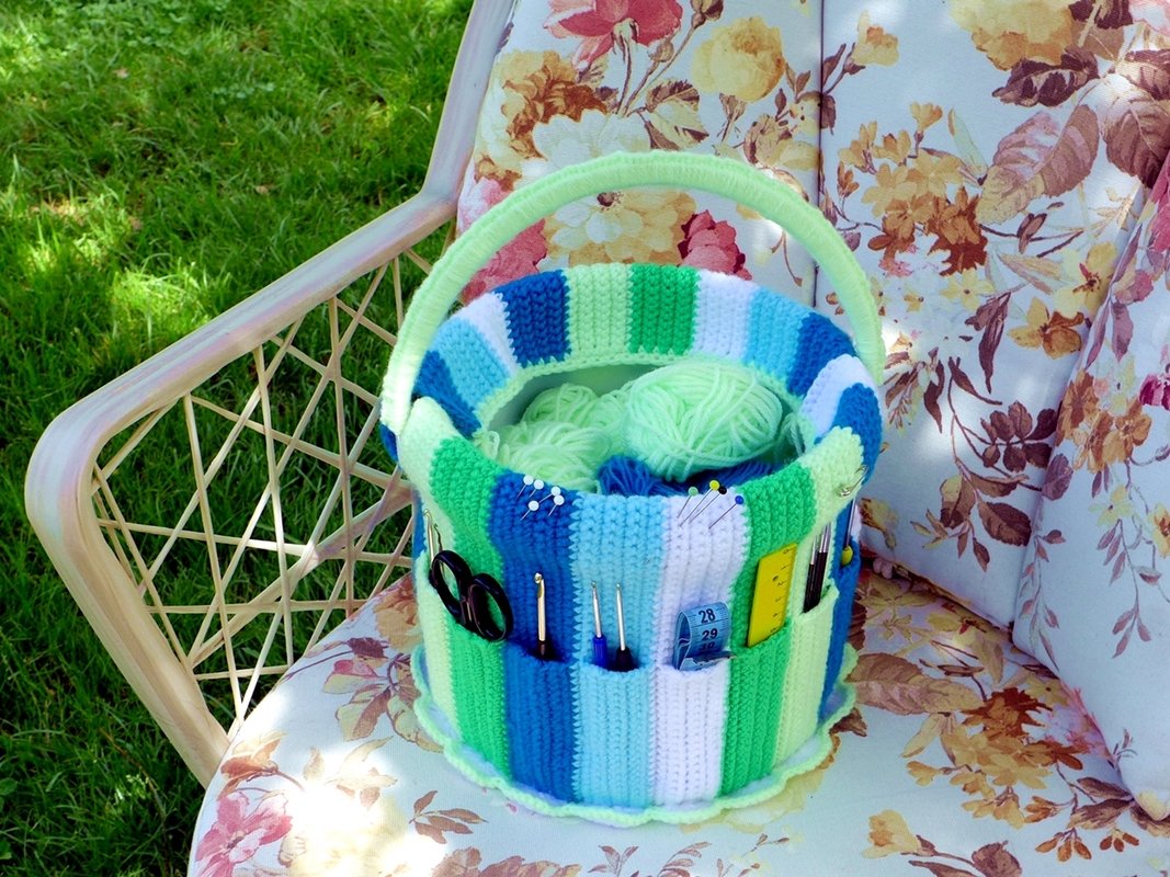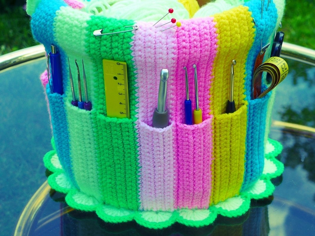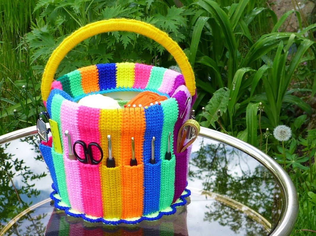 At last, a lovely and practical place to keep our needle working tools. In the needle work bucket, all your crochet hooks, scissors, and other tools find a place. Organized by size, you have everything in sight and don't have to search any longer. The current crochet work in progress and yarn fits in the bucket. So equipped, you can settle in anywhere with your craft bucket and always have it with you.