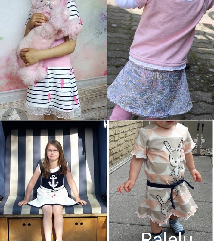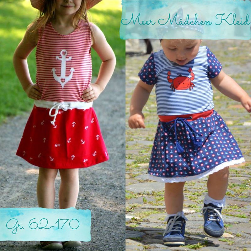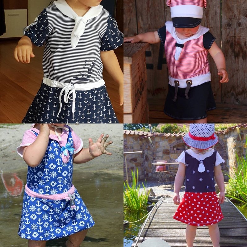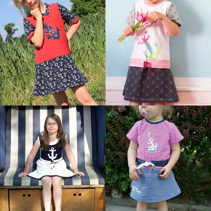 Durch den riesigen Größenumfang kannst du auch wunderbar Geschwister- oder Mama-Tochter-Kombinationen gestalten. Der Grundschnitt besteht aus einem langen Oberteil, mit einem kurzen Rock. Das Oberteil sitzt körpernah und gemütlich und wird in den Erwachsenengrößen mit einem Brustabnäher an deine Figur angepasst. Der Rock endet auf Kniehöhe und kann bei den Größen 36-46 auch verlängert werden. Der Schnitt enthält normale Ärmel, sowie Kappärmel. Die Ärmel kannst du optional noch mit kleinen Knopfriegeln versehen. Das Kleid wird mit einem Tunnelzug auf Hüfthöhe genäht, hier kannst du zwischen eingenähtem oder aufgesetzem Tunnel wählen. Der runde Halsausschnitt kann mit Bündchen gesäumt werden, oder du nähst einen maritimen Kragen an. Um dein Outfit abzurunden, kannst du verschiedene Plottvorlagen nutzen, die mit einer Kurzanleitung für das Arbeiten mit dem Schneidplotter daher kommen. Die maritime Plottserie ist in Zusammenarbeit mit Kikykidz entstanden.