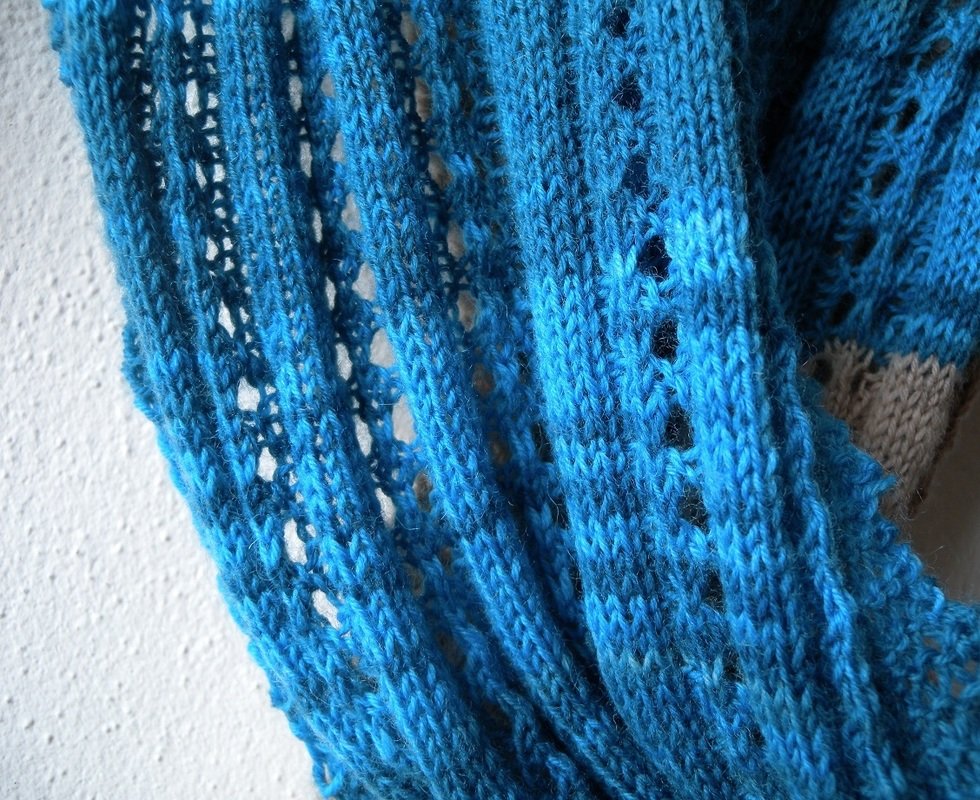 The sample shown in the pictures was made out of Lana Grossa Meilenweit Tweed in beige and Lana Grossa Meilenweit Special in blue. Both qre quite commonly used sock yarns here in my part of the world, nothing fancy. Similar yarns are certainly available all around the world. Also other yarn weights will work for the pattern. I can very well imagine the scarf worked in a sport weight or dk weight yarn. Use one color or more, just as you like.