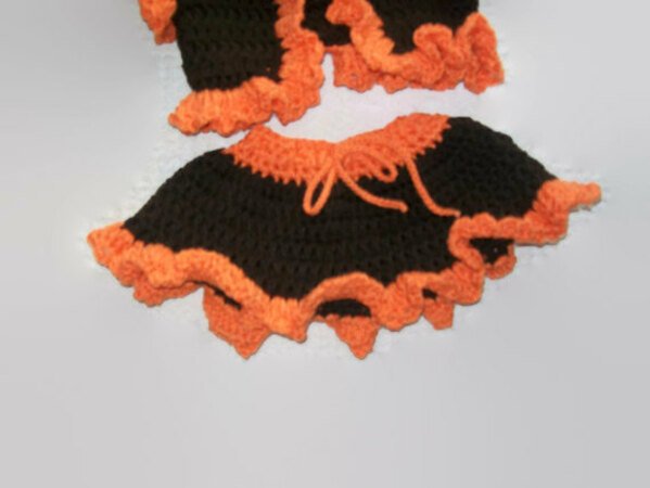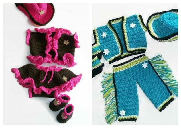 This is not a finished product but 2 patterns for the items shown in the pictures. Easy and fun crochet cowboy and cowgirl patterns. For sizes Newborn 0-3 months and 3-6 months. The cowgirl set comes with instructions for the hat, vest, boots, skirt, and diaper cover. The cowboy set includes instructions for the hat, vest, pants with fringe, and boots with spurs.