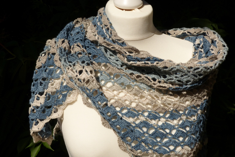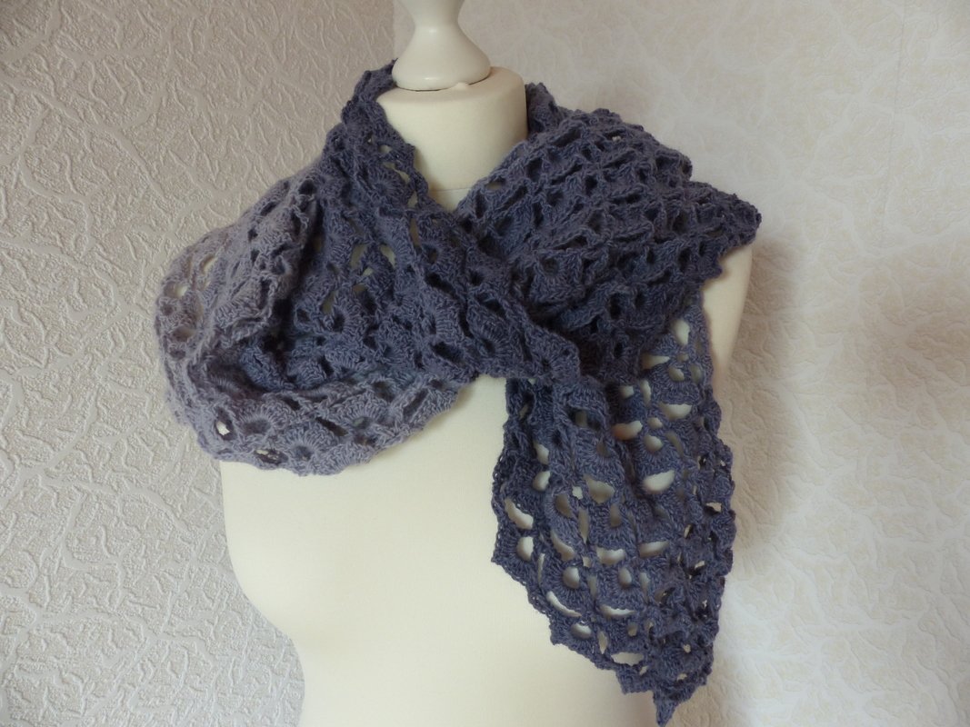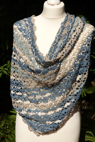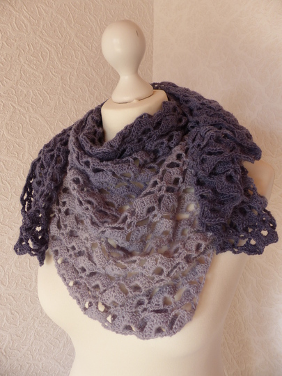 Ein schönes Tuch mit einem Mustersatz von zwei Reihen. Es wird an der Spitze begonnen und durch Zunahme am Rand je nach gewünschter Größe gehäkelt.