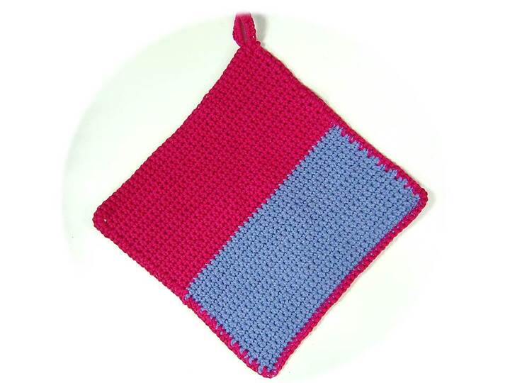 30 g Pink + 30 g Jeansblau eines Baumwoll-Garns (wenn Hitzebeständigkeit gewünscht 100 % Baumwolle verwenden!) mit 125 m auf 50 g (hier verwendet: Baumwoll-Mischgarn Pantino von Schoeller+Stahl), Häkelnadel 4,0; Maßband, Schere, Wollnadel zum Vernähen.