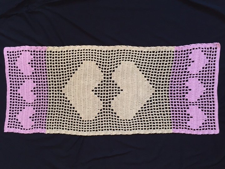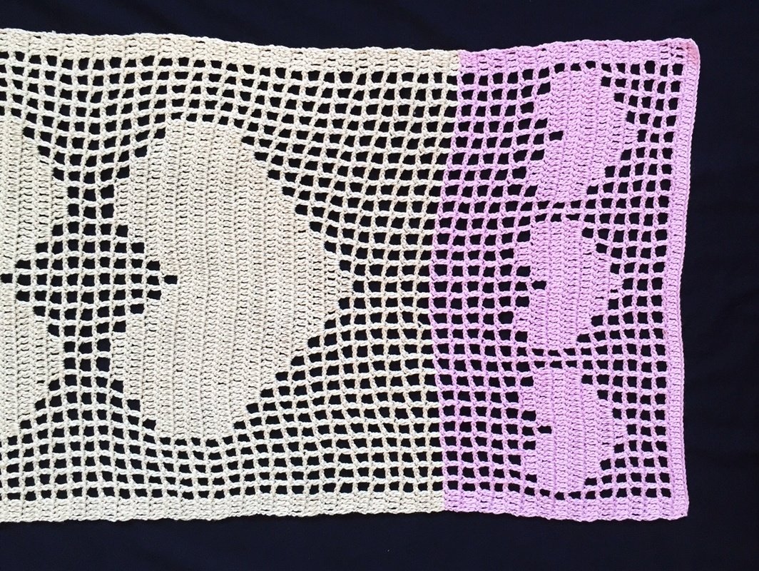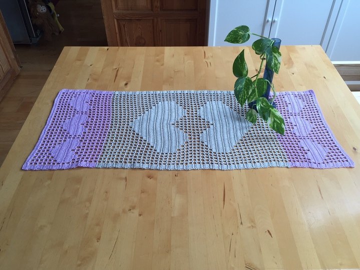 This table runner is easy to crochet, even if you have never yet crocheted filet mesh, because these instructions show you exactly how it’s done. All you need to know is how to crochet chains and double crochets. The first rows are explained step by step for you, the rest of the cloth is crocheted according to the chart that is easy to understand and explained in detail.