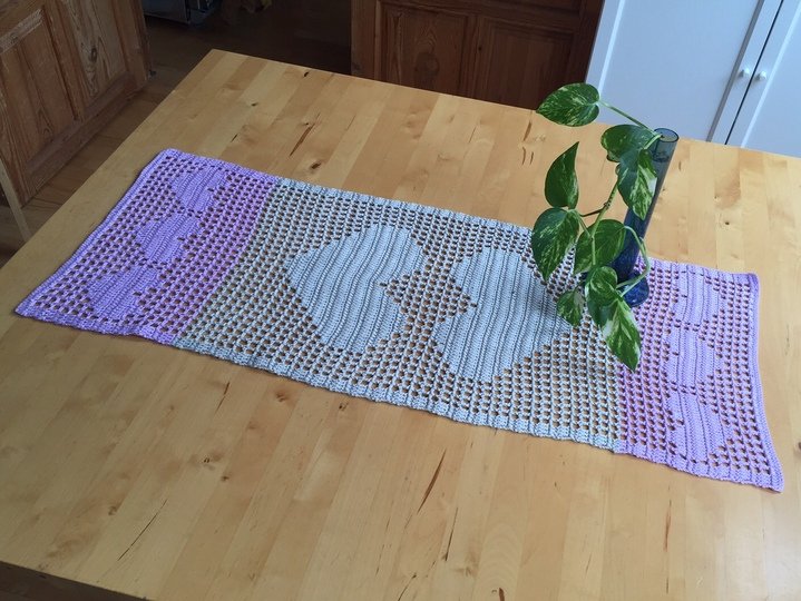 If you work with the recommended yarn and needle size, and once you have made a gauge, the finished table runner will be about 15" wide and 36" long (38cm x 90 cm).