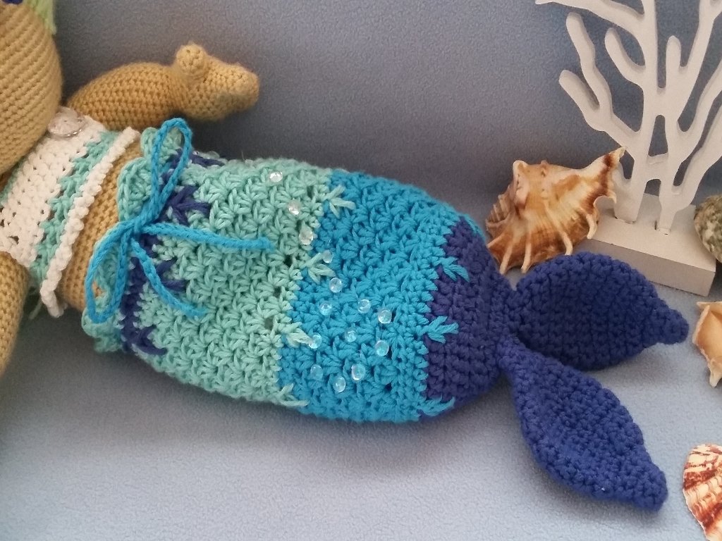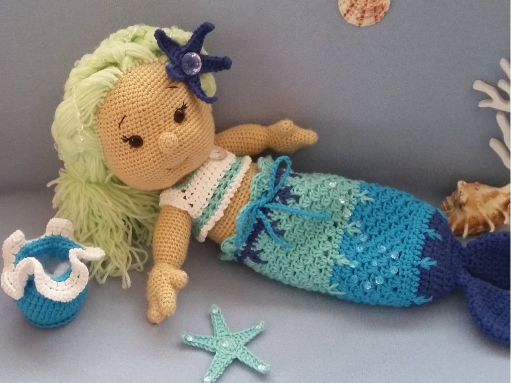 Die PDF beinhaltet die Anleitung für das Bikini-Oberteil, den Meerjungfrauenschwanz, die Seesternhaarklemme, sowie für die kleine und die große Seeanemone.