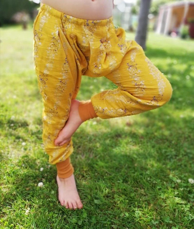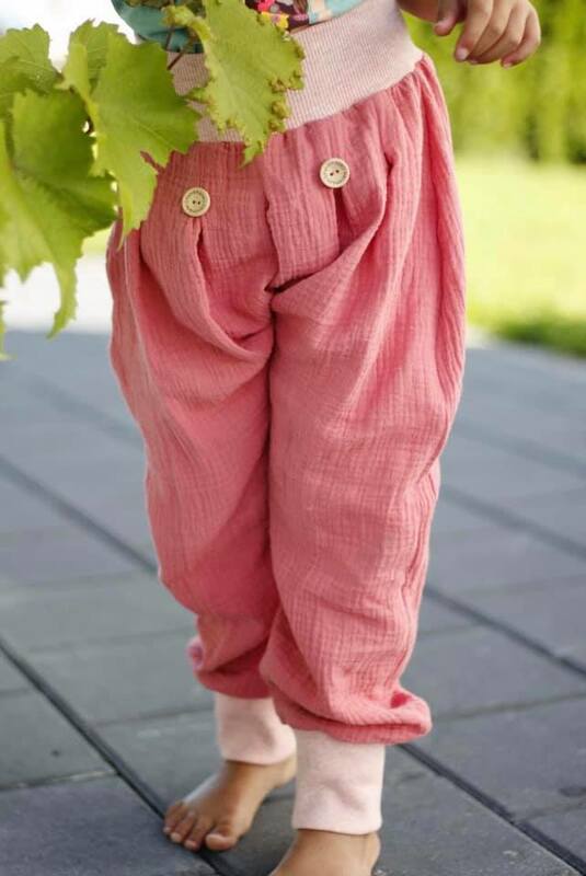 Es wird beschrieben, wie diese Hose aus Musselin genäht werden kann. Du kannst den Schnitt natürlich aber auch verwenden, um dehnbare Stoffe wie Jersey, Sommersweat, Viskosesweat oder normalen Sweat zu vernähen. Auch Frottee oder Popeline sind möglich.