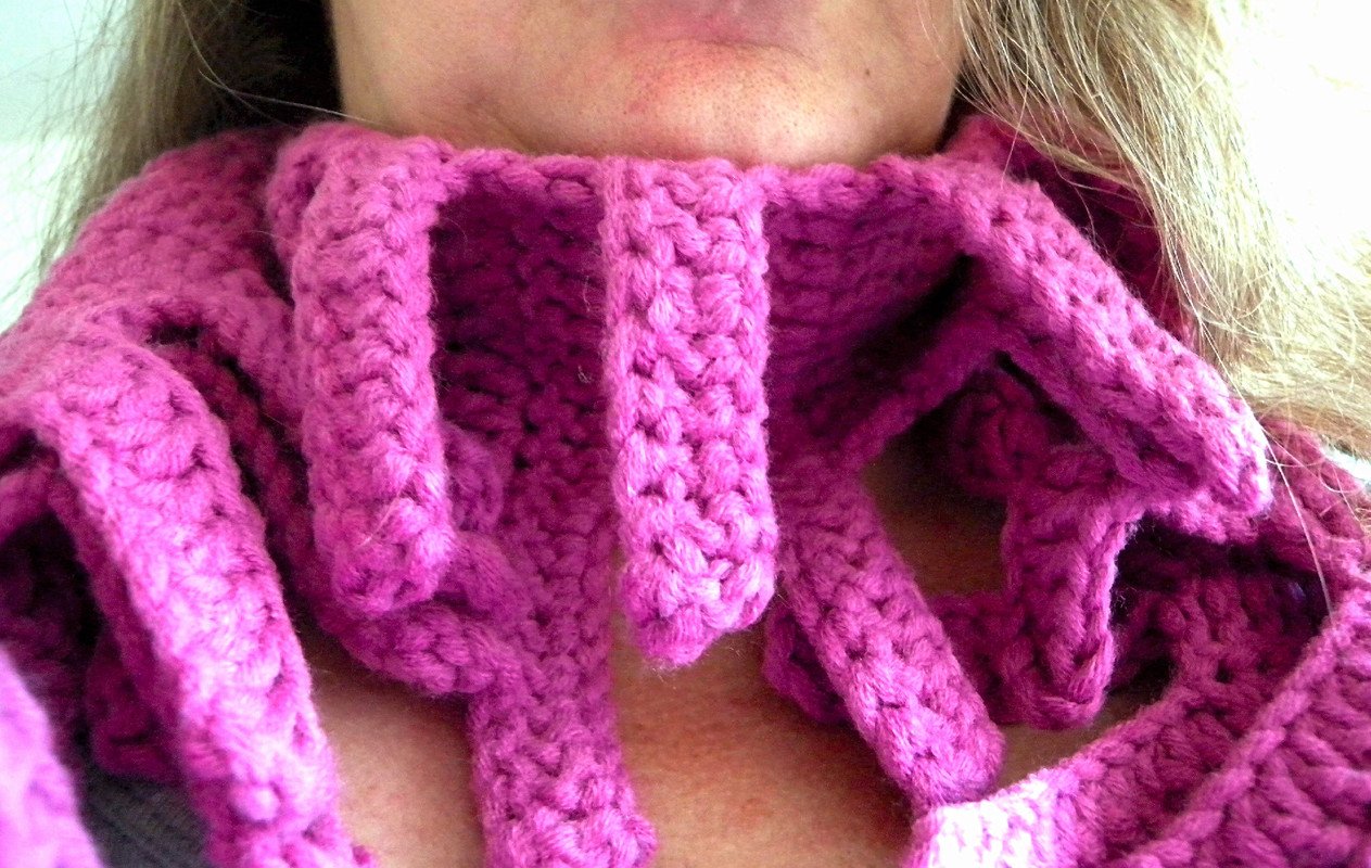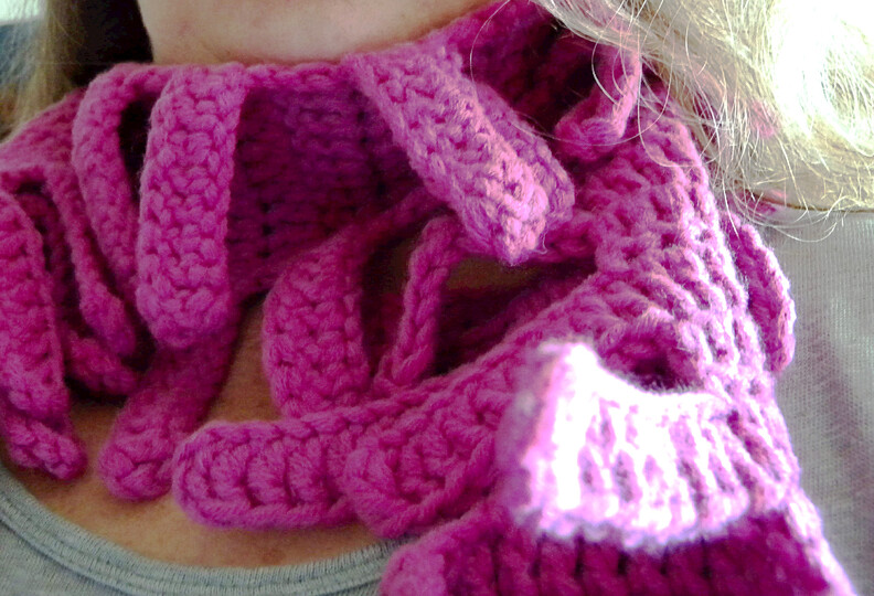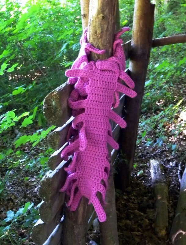 "Millepede" - a crochet pattern for a trendy scarf with a fringe. It is worked in super bulky yarn for a quick result and is a very easy pattern. Definitely suitable for crochet beginners. The result will be a spiffy scarf for women or little girls, a soft and warm scarf and something to feel good with.