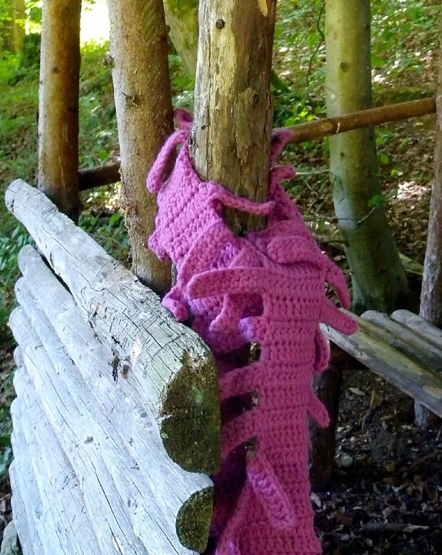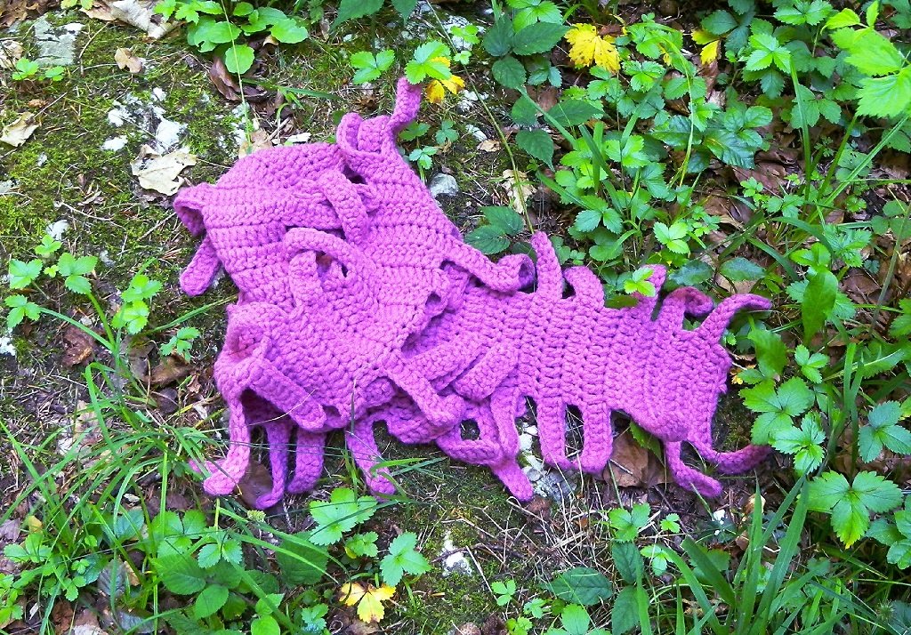 The sample shown in the pictures was made out of Lana Grossa Mille II, a chunky wool and acrylic blend. Similar yarns are certainly available all around the world. Actually mine is pink, I didn't get the color quite right in the pictures. Use any color that you like, this will look cool in any color.