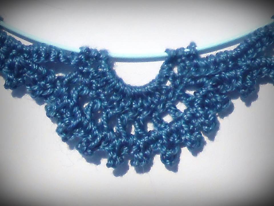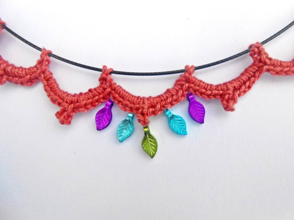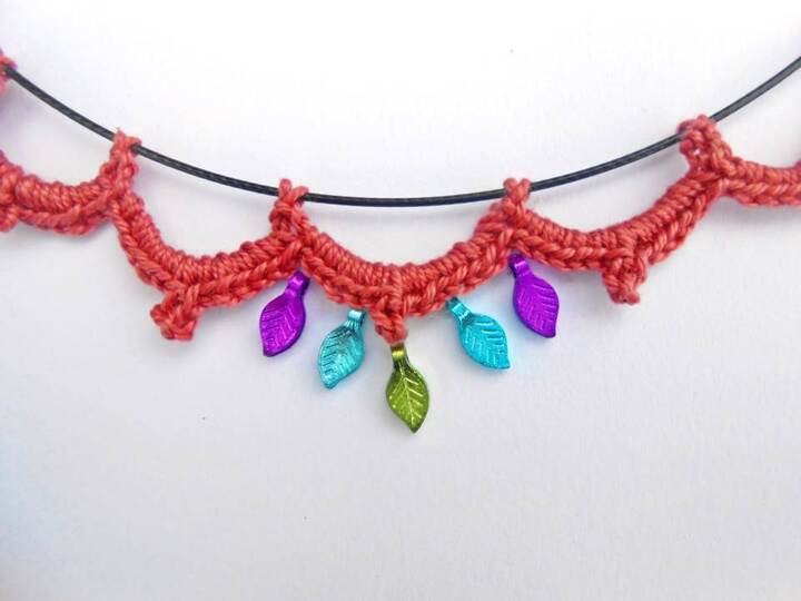 Gehäkelt wird an einem Stück direkt an das Collier-Seil, dadurch entfällt das lästige vernähen von vielen Fäden.