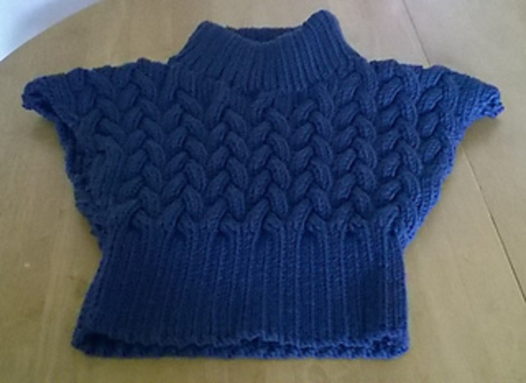 This fashionable crop top has a deep ribbed welt, capped sleeves and turtle neck. The main body is worked in an all over cable pattern. It is comprised of two main pieces, the front and the back with the neck being knitted flat once one shoulder seam has been sewn up. The top is finished by sewing up the second shoulder seam and neck band and side seams. The neckband is then folded in half and slip stitched down on the inside of the neck.
