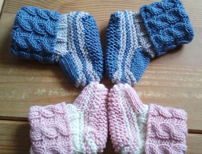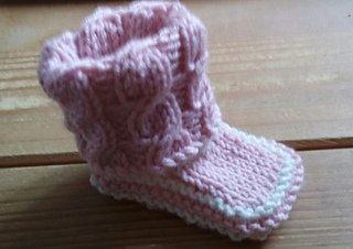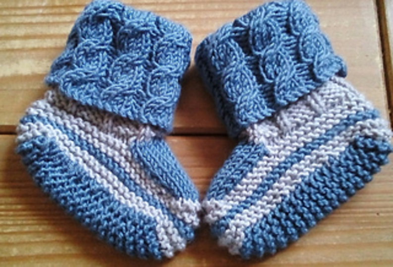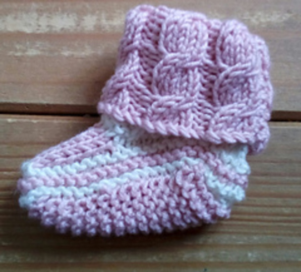 These multicoloured, delightful little booties are knitted from the top down with a turnover cable cuff at the top adding a touch of extra style. They are perfect for using up oddments of leftover yarn. For the samples, the smaller size took 25g (58m/64 yds) of main colour and 9g (21m/23 yds) of contrast colour and the larger size took 34g (79m/ 87 yds) of main colour and 18g (42m/46 yds) of contrast colour. They can be knitted in any DK weight yarn as long as an adjustment to needle size is made if necessary.
