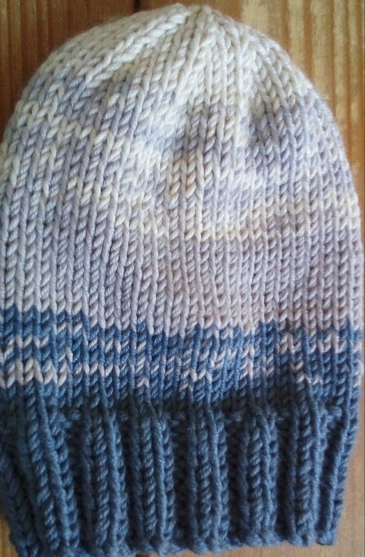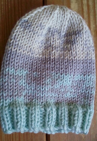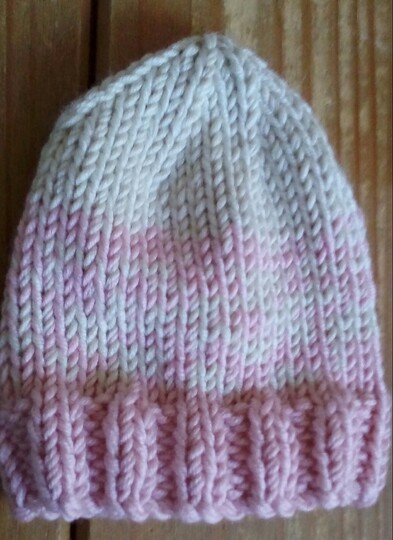 These delightful baby hats can be knitted from oddments of leftover DK yarn. The pattern gives detailed instructions for using three different yarns, using the amounts shown below for the 3-6 and 6-9 month sizes. Instead you can just keep knitting until all your yarn is used up and then change to another colour. This is what was done in the smallest, 0-3 month, size hat. The yarn is used double and the pattern created by alternating the sections between two strands of the same colour and two strands of different colours.