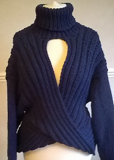 This interesting crossover jumper is easier to knit than you would expect. It is made up of 4 strips of k2, p2 rib sewn together in such a way as to create the crossover at the front and the interesting tear drop detail on the back. The sleeves are added and the turtle neck gives the sweater the perfect finish. Instructions are also given for a lower, mock turtle neck if preferred.