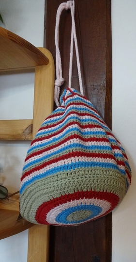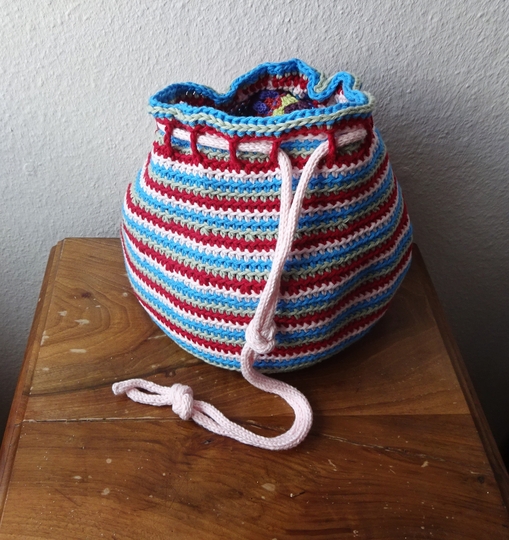 Fröhlich bunt gestreift kommt er daher, mein "Häkelbüdel".