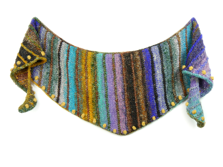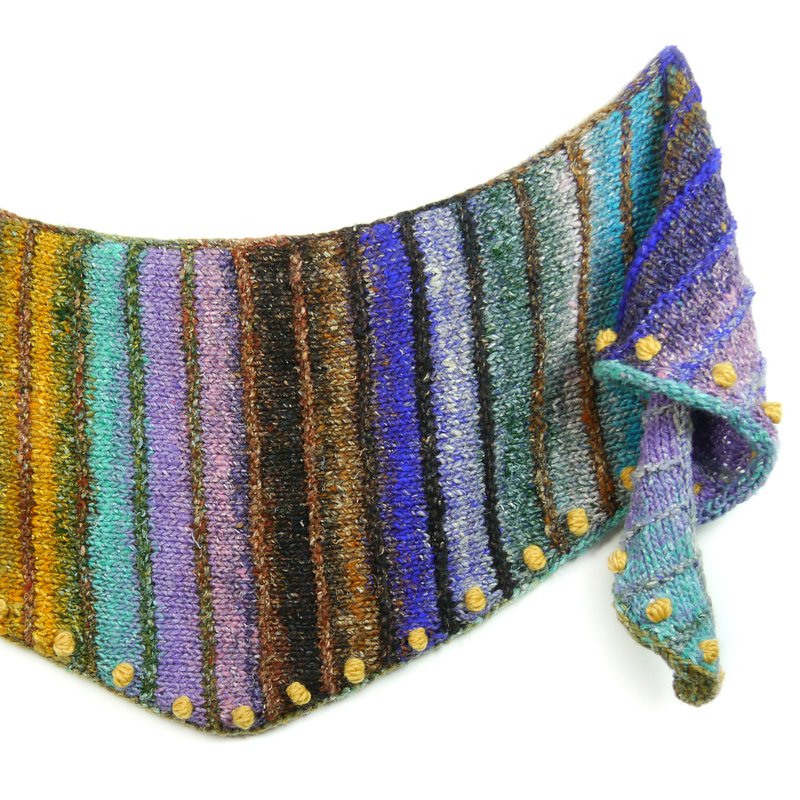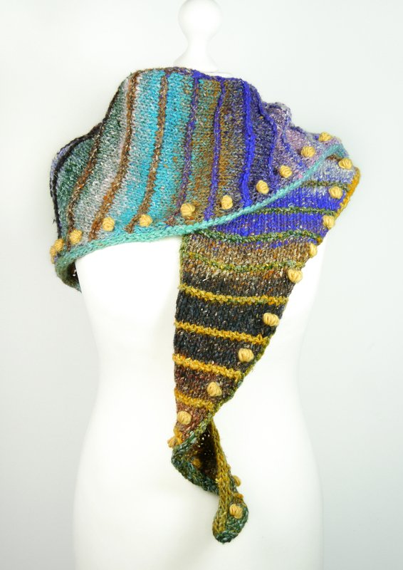 Oh, if I could only resist all those stock clearings, especially with gradient yarn! As I guess I am not the only one, I wanted to design something easy to use up any rather small amount of gradients, that is not enough for a pullover but too much for a hat. Designed for using up these two skeins (200g g) of NORO OBI yarn or any other variegated and rather thick yarn that still hides in your cupboard, SNUGGLY SNUGGLE is a real stash buster. I love NORO yarns, but I always have the feeling that I have to tame them a little – here I added small garter ribs to frame the bold colour blocks. A quick and easy knit, the shawl with its elongated crescent shape makes a great present. Beginners who want to learn something new will like the step-by-step instructions. Crocheted bobbles add fun, but if you find them too playfull, just skip them.