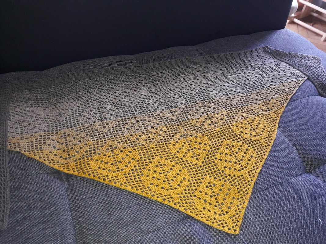 The shawl is made using the filet crochet method