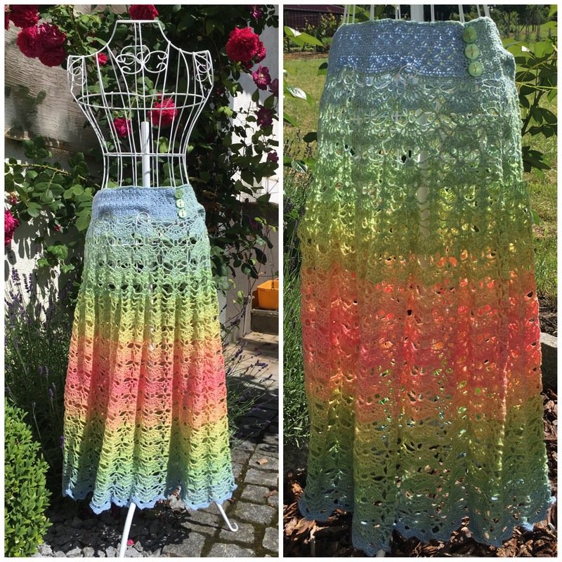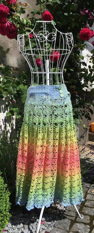 Hinweis: Der BOBBEL kann wunschgemäß von innen oder von außen verwendet werden. Den 2. BOBBEL entsprechend gegengleich verarbeiten. Für die größte Größe reichen evtl. 2 BOBBEL nicht ganz – hier kann der Rock auch etwas kürzer gearbeitet werden.