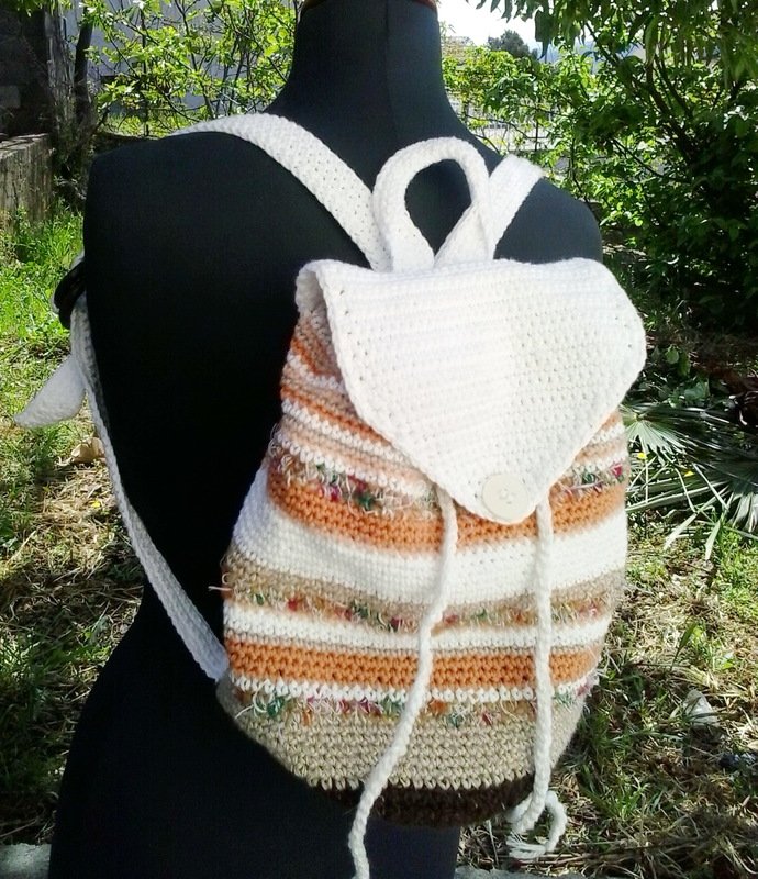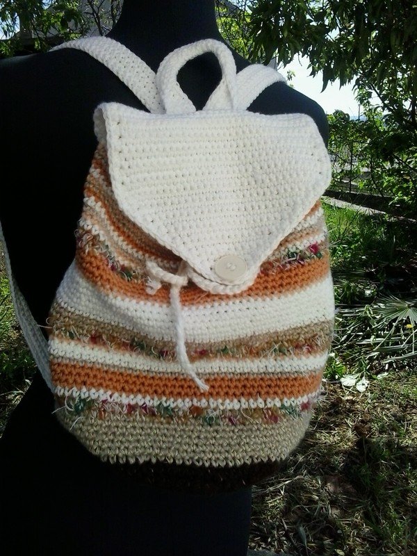 This beautiful boho style crochet striped backpack made of cotton and acrylic yarn. Colored in white and brown tones. Materials used: cotton and acrylic yarn, plastic button, plastic rings.