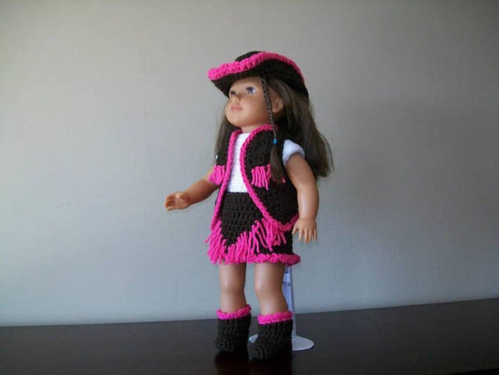 Crochet doll pattern for an 18" doll. This cute little cowboy costume is the perfect way to dress up . The 18" doll pattern will fit all dolls of that size along with the American girl doll.