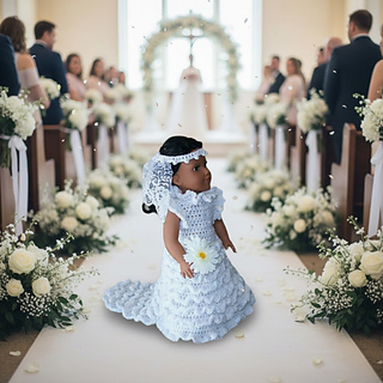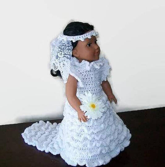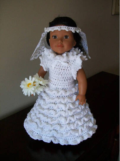 Crochet doll clothes patterns are probably some of my favorite things to make. This crochet 18" Doll wedding dress is one of my favorites. Easy patterns for dolls. Made with ruffles all around the dress and then following down onto the train of the dress. Sleeves with flair and a bit of ruffle, and beads down the front.