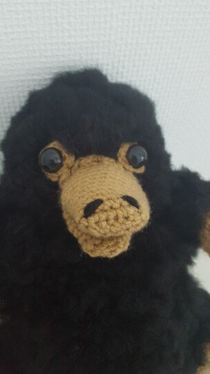 Ihr braucht Schwarzes Garn der NS 3-4 ca 300g, sowie weniger als 50g Garn in nougat; Sicherheitsaugen in braun 14mm; einen Glitzi-Schwamm; Füllwatte vorzugsweise in schwarz; und eine Tierhaarbürste aus Draht.