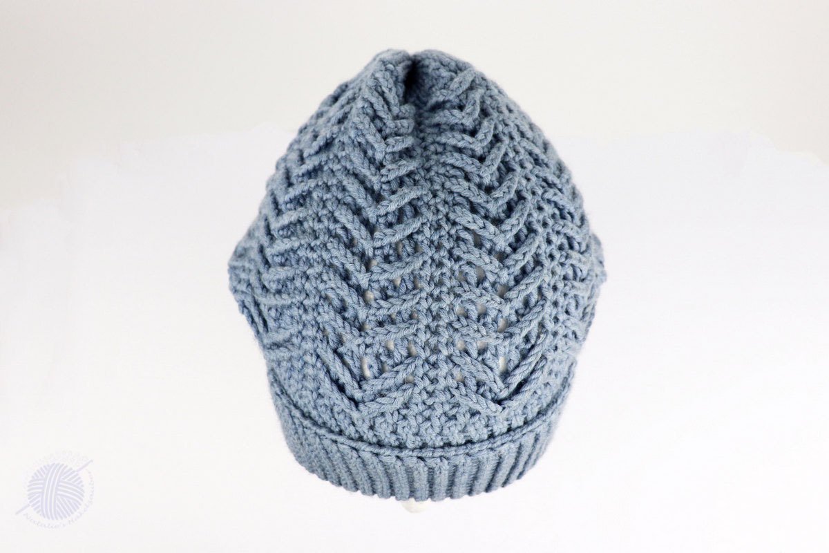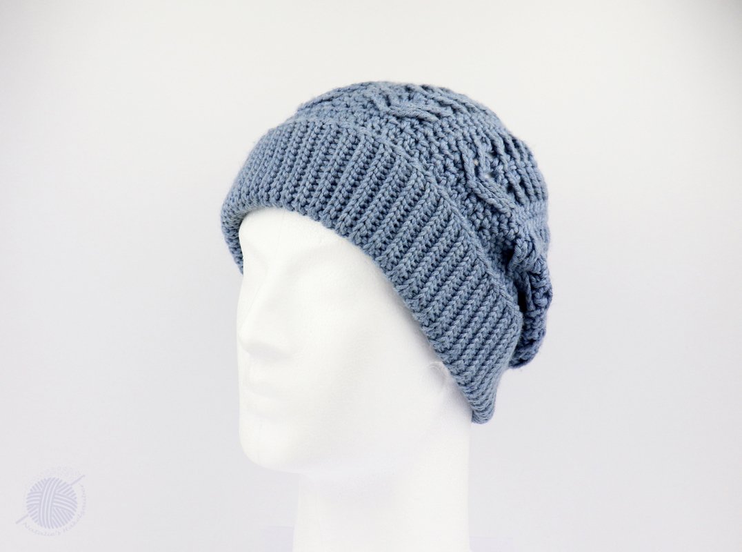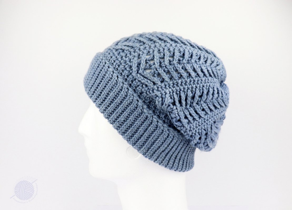 PDF crochet tutorial consists of illustrated pattern on how to crochet a hat with the pattern that looks like knitted. The cuff also looks like knitted. The hat can be crocheted with or without turn-up (cuff folded upwards). For the slouchy beanie, crochet the middle to the total length of 25 cm, for a normal beanie (sporty hat) to the total length of 16 cm.