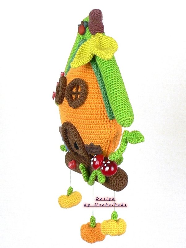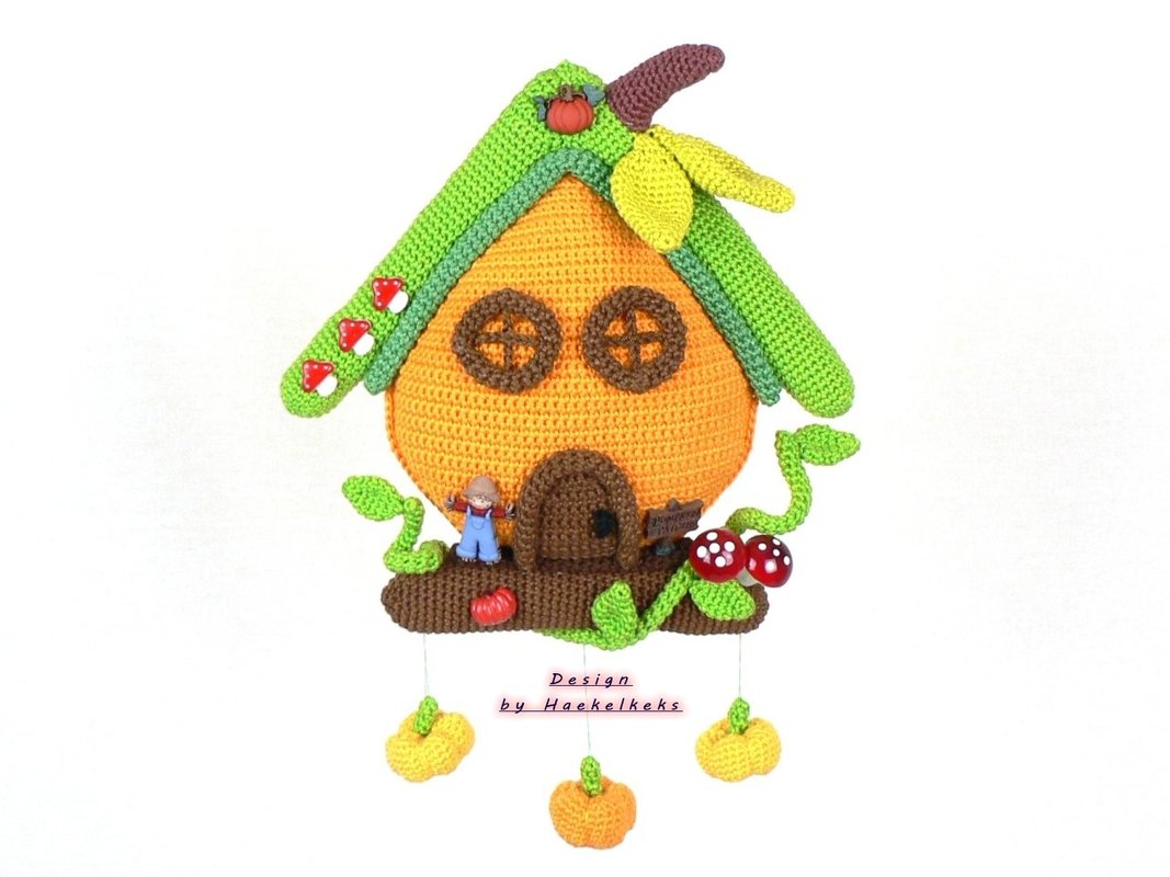 Die endgültige Größe ist je nach Garn, Nadelstärke und Häkelfestigkeit verschieden. Das Kürbishaus (ohne die hängenden Kürbisse) wird ca. 23cm hoch und ca. 22cm breit.