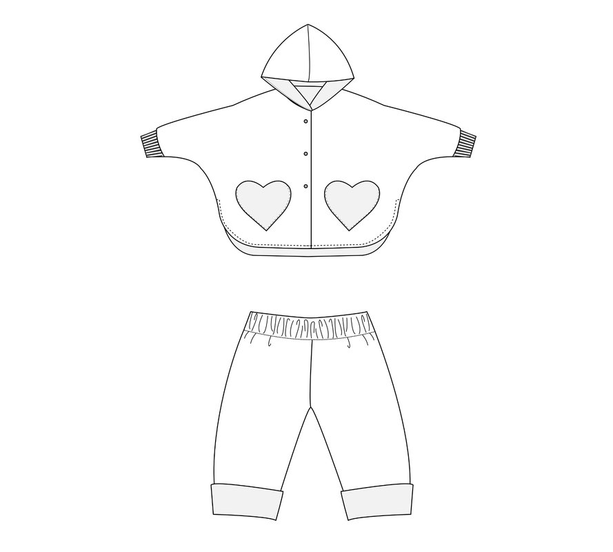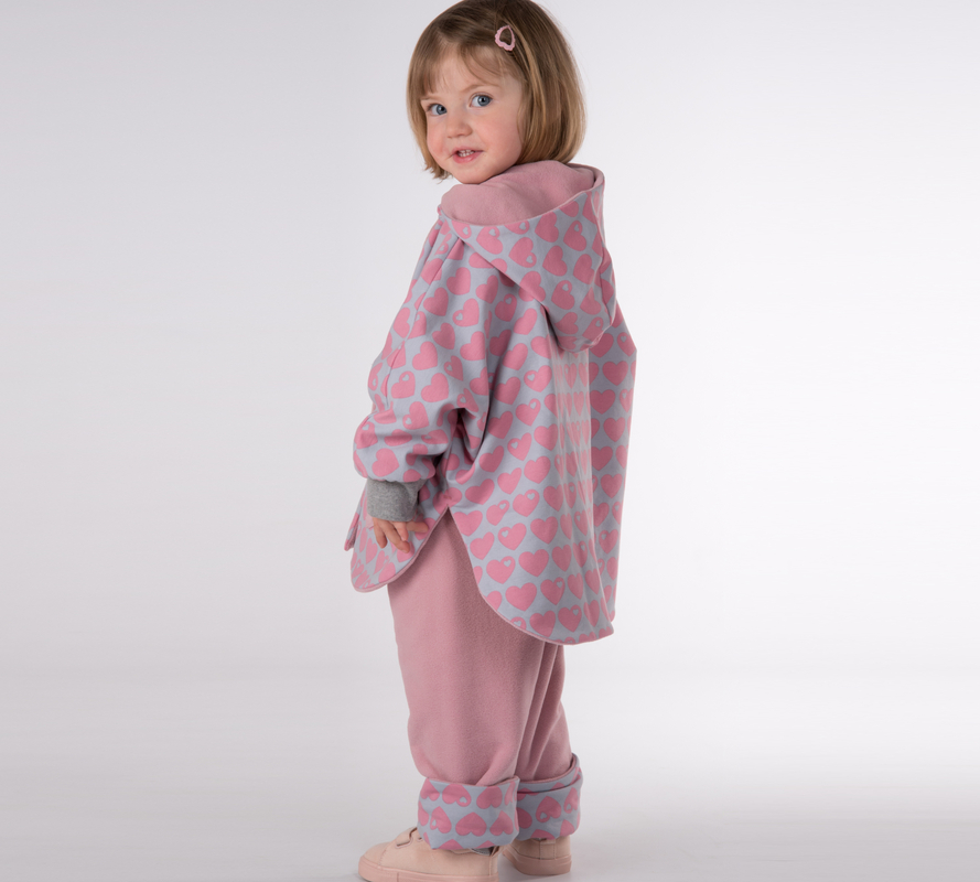 This digital combo set includes two favorite pieces for babies and kids: the reversible hooded poncho MARA and the reversible pants FIOCCO with an elastic waistband. Both items are lined and fully reversible—perfect for spring, autumn, and winter. The poncho closes with snaps for easy on and off, and MARA offers two pocket options.