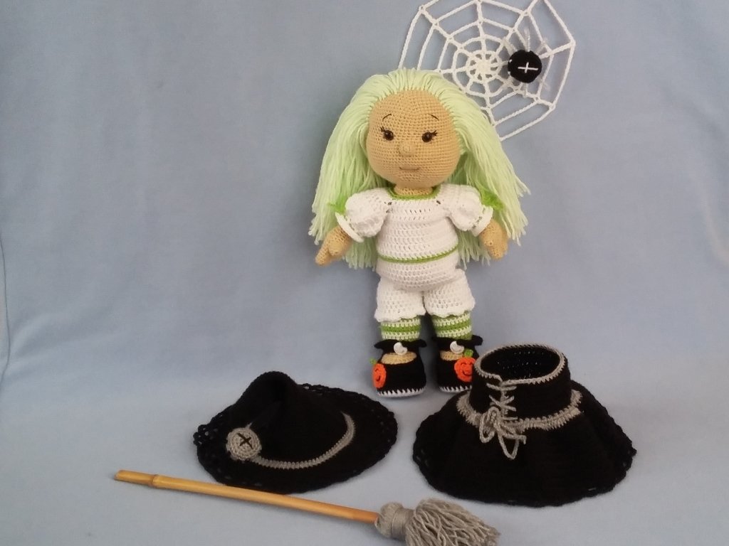 The PDF contains the instructions for the doll, the blouse, the skirt, the shoes, the witch hat, the panties, the witch's broom, the spider and the spider web.
