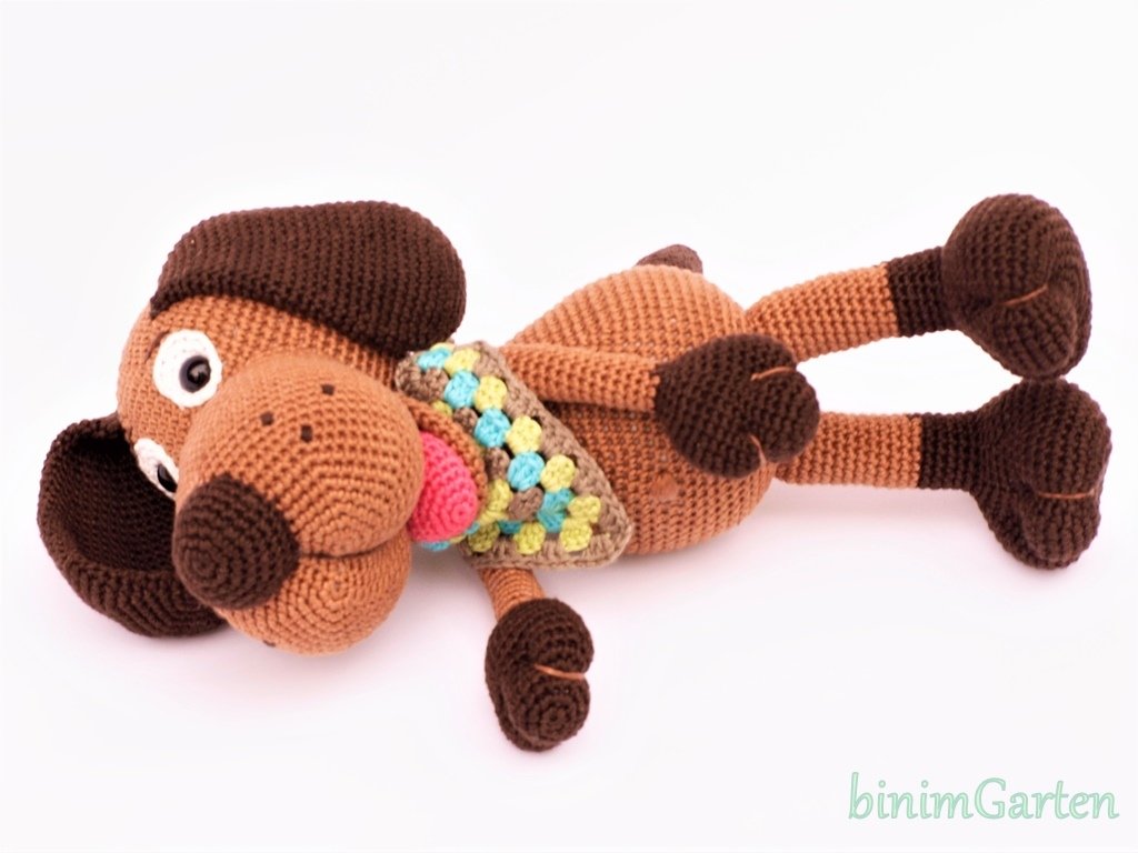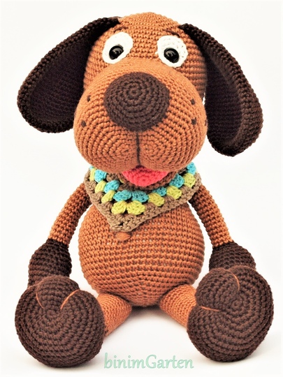 Der Hund Henric wird ca. 30 cm groß. Ihr könnt auch in seinem Bauch gut eine Spieluhr verstecken.