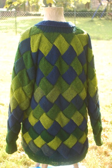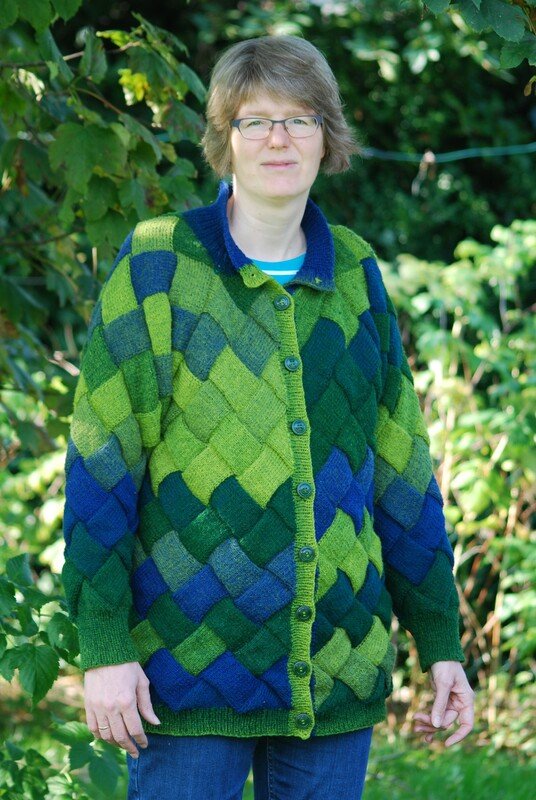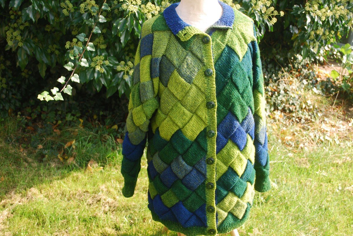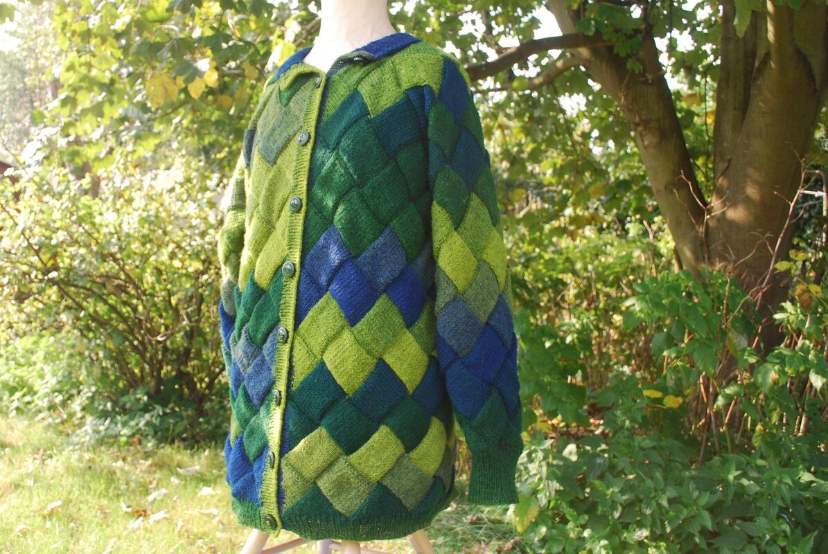 Eine warme Raglan-Jacke für den Herbst, die von oben nach unten im Entrelac-Muster gestrickt wird. Die Anleitung enthält die Größen M,L und XL