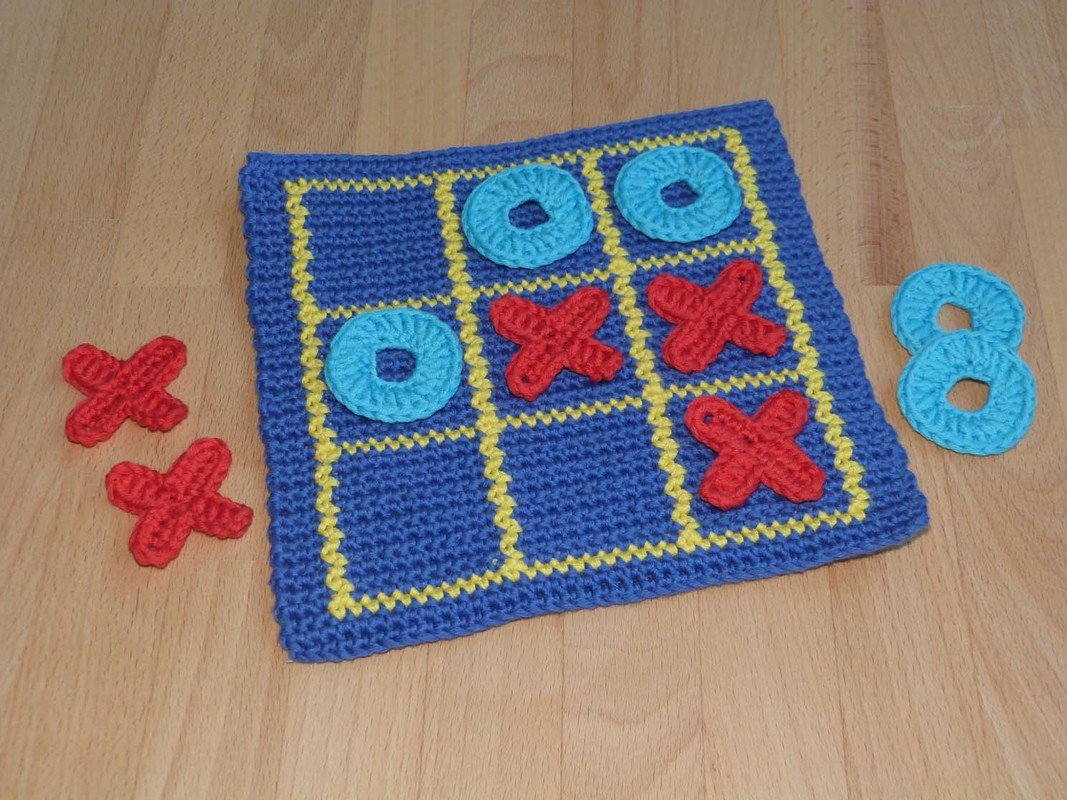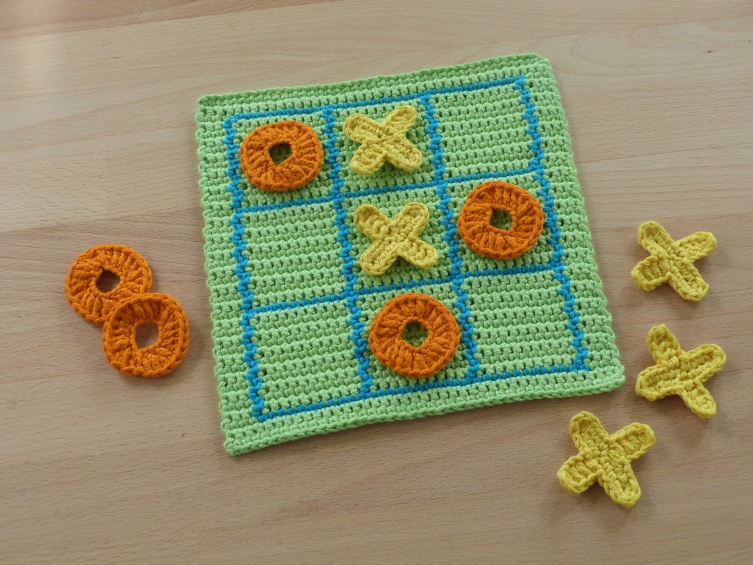 If you use cotton yarn with a yardage of 200y/3.5oz (90m/50g) and a hook size 3, the field will get a side length of approx. 20 cm and the tokens will become about 4.5 cm wide.