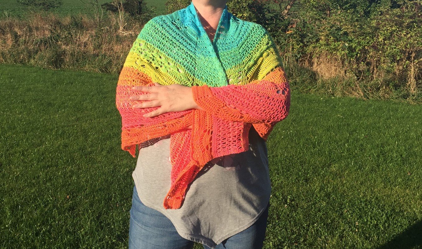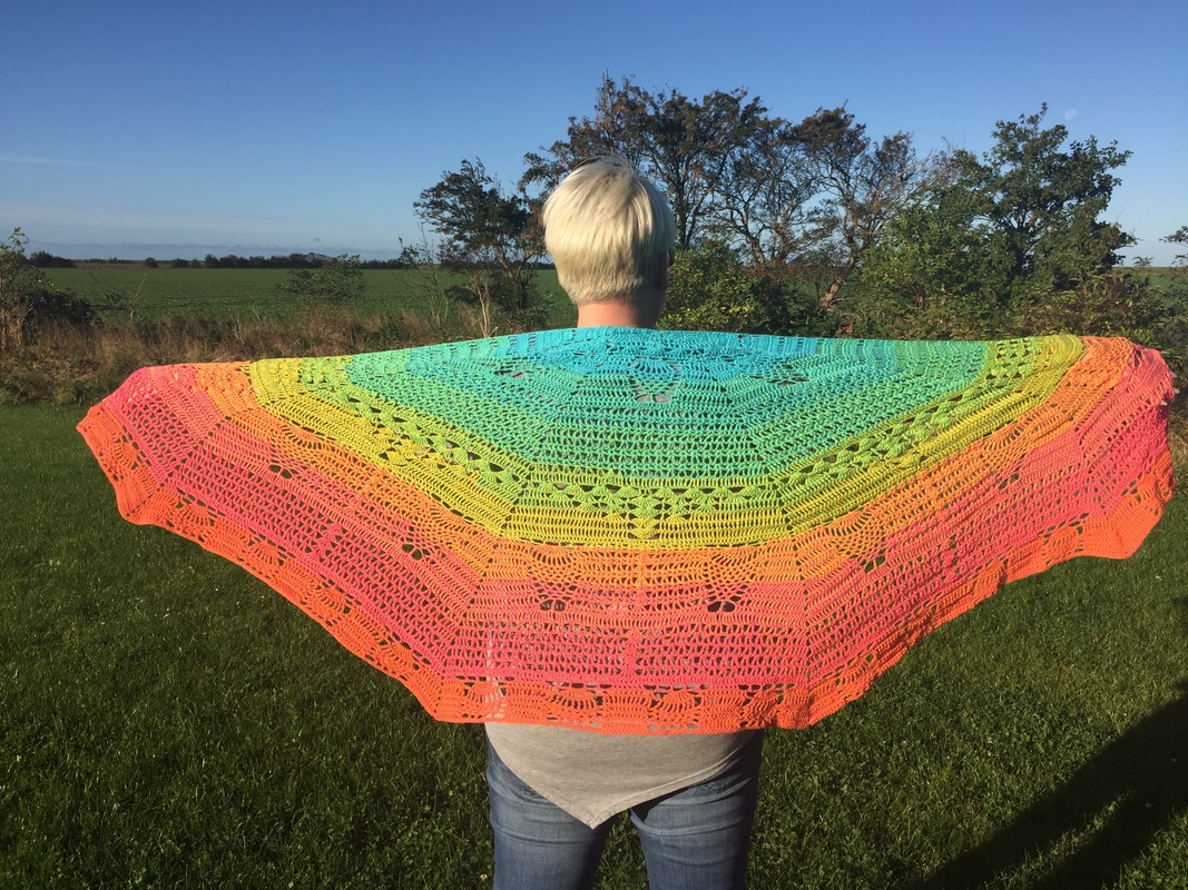 Das Tuch mit Geschichte... Hold my best friend warm ist für meine beste Freundin entstanden, die mir im Sommer mitgeteilt hat, dass sie für 3 Jahre nach Amerika geht. Ich wollte sich nicht allein gehen lassen und hab angefangen, für sie das große Tuch zu entwerfen. Ich wollte ein Allzwecktuch für sie haben: ein Halstuch, ein Schultertuch, einen Pareo (sie wird in der Nähe vom Strand wohnen). Also ein Tuch für alle Lebenslagen und das ganze auch noch schön und fröhlich bunt... Bis sie drei Wochen später erzählte, dass sie heiratet... Also hab ich ihr das gleiche Tuche nochmals in gedeckteren Farben in Modalbaumwolle gehäkelt. Ein Foto der Braut findet ihr auch bei den Beispielbildern. Jetzt kann ich sie beruhigt gehen lassen :)