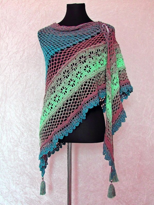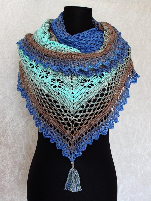 This beautiful triangle-shaped shawl is crocheted in an unique way. The first part is worked from the tip to the neckside and then it changes from the neckside to the lower tip and back to the other neckside.