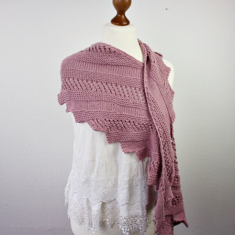 Soft Drift features a gently rounded shape created with short rows. Textured stripes and delicate lace sections alternate in a steady rhythm, resulting in a soft drape and a balanced silhouette that sits comfortably around the shoulders and neck.