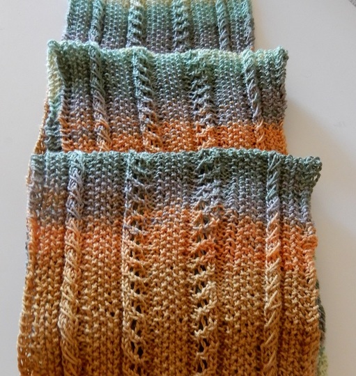 The scarf is worked in a fingering weight yarn, using an easy lace and slip stitch cables pattern. The cables can be done with or without a cable needle, both ways are explained. The pattern is written and charted.