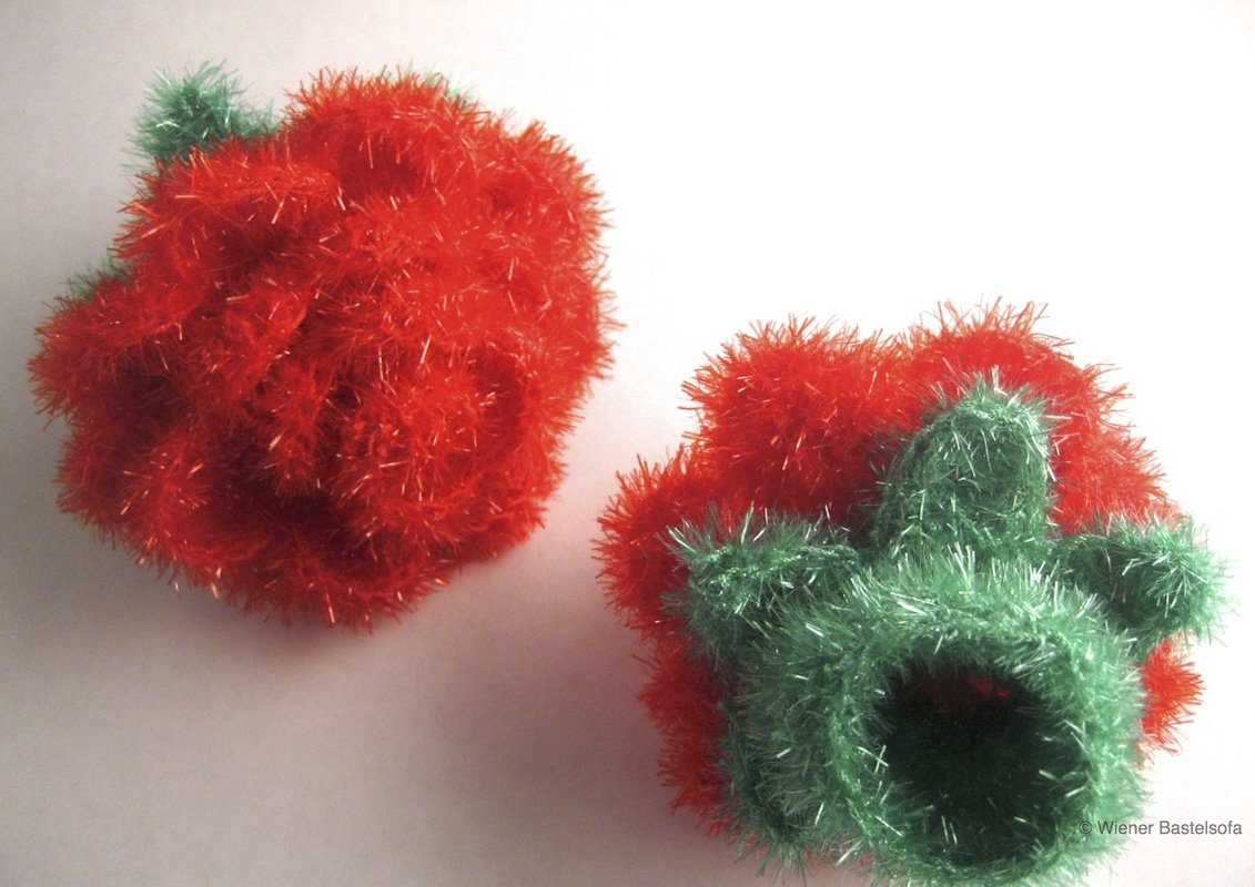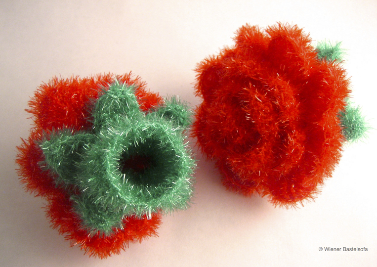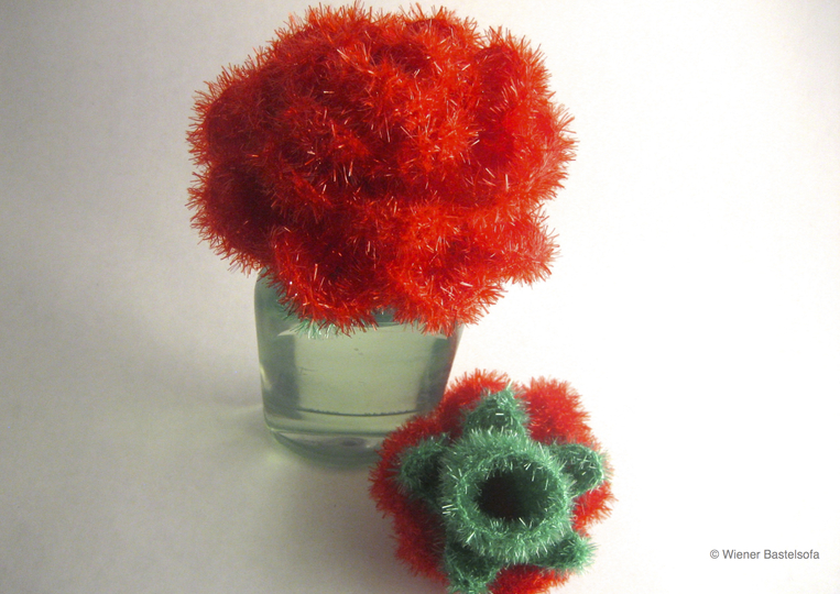 Der Rose hat einen Durchmesser von 11 cm und ist 9 cm hoch. Sie wird mit Häkelnadel Nr. 4 mit Rico Creative Bubble (50 g/ 90 m) in grün und rot gehäkelt. Waschbar laut Garnhersteller mit 60 Grad.