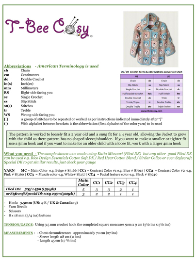 The pattern is written with US terminology but also includes metric measurements and UK conversion chart