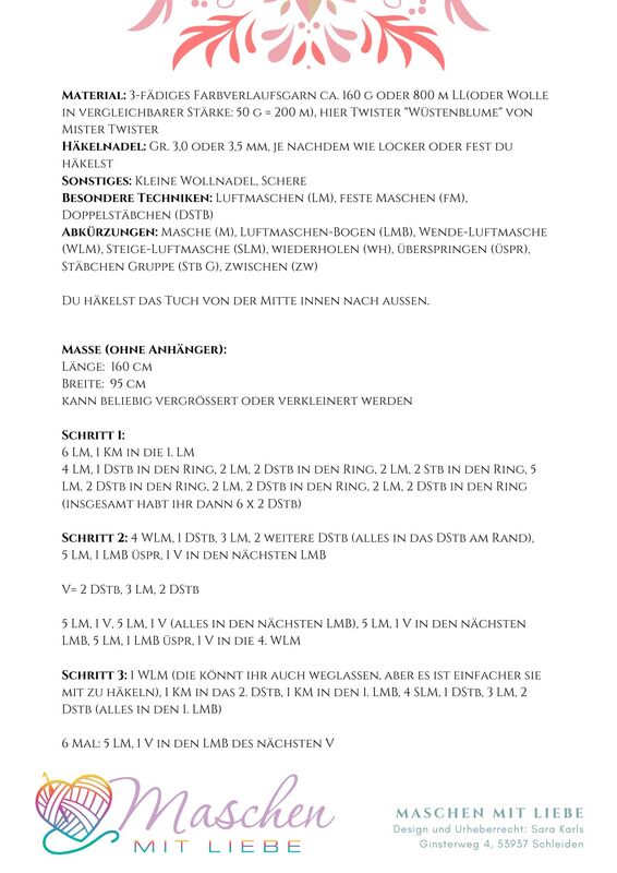 For the one who needs a nice, simple and quick gift for Christmas, this pasttern is just the thing! You can handle with treble crochets? Then purchase the triangular shawl "desert flower"!