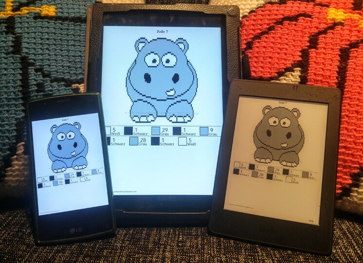 Die Anleitung enthält zusätzlich eine PDF Datei mit der genau abgezählten Maschenanzahl jeder Farbe pro Reihe. Diese Datei kann auf Tablet und / oder E- Book Reader geladen werden um auch unterwegs bequem häkeln zu können. :)