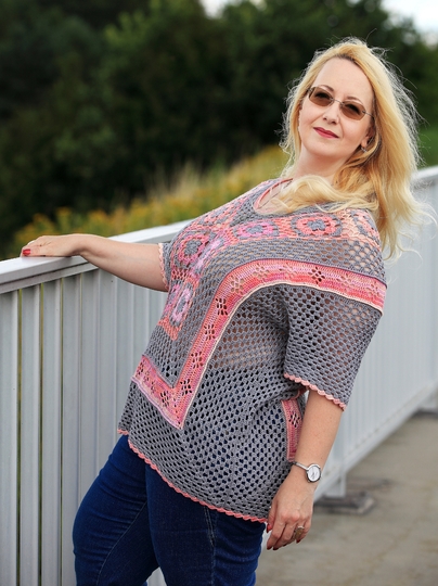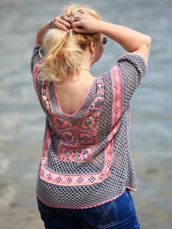 Flower Power is the name of this beautiful tunic, which draws the eye with its simple but effective pattern. Single granny squares are joined together and form the neckline. Then you work around the squares. A lace flower pattern provides another eyecatching feature.