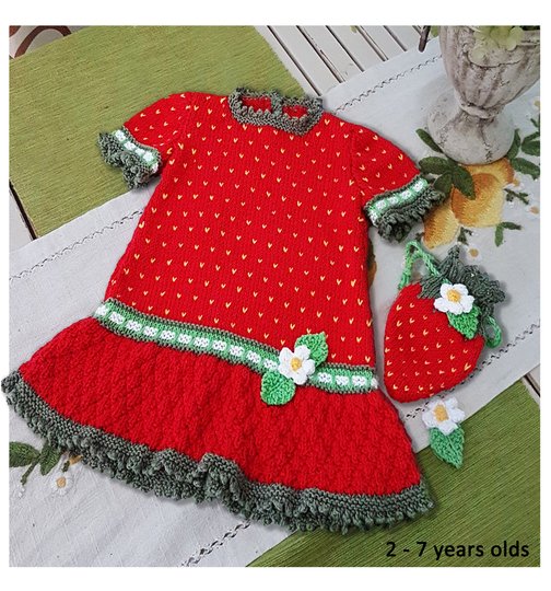 Easy to follow and make this cute DK yarn dress for 2 to 7 year old with a matching purse, which can also be a store holder for a your younger child for its dummy