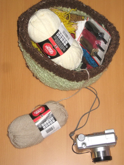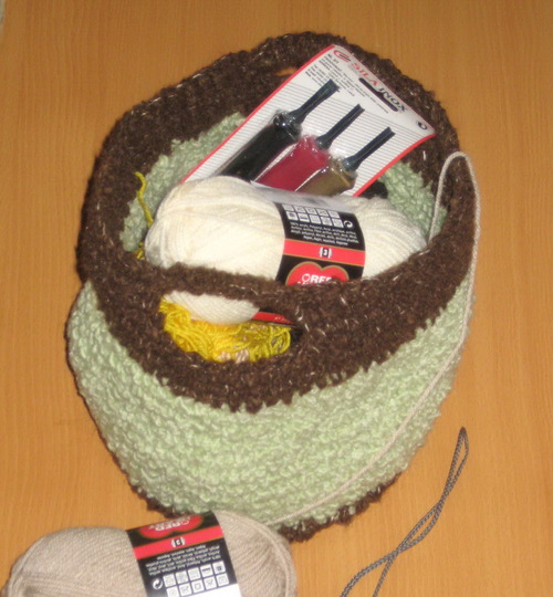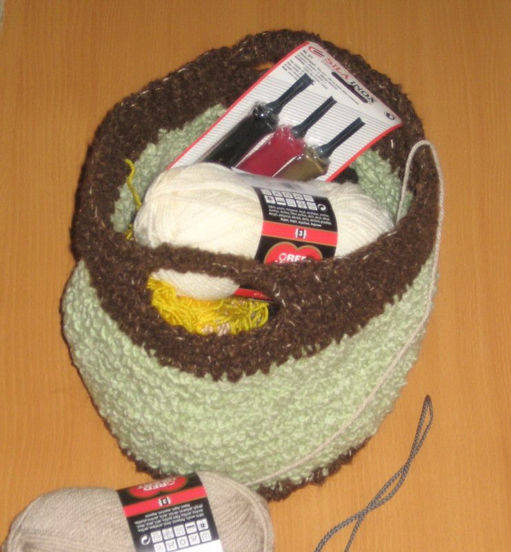 This is a very easy free pattern to make crochet basket. Basket is made from mohair/acrylic bulky yarn. You will need 3 skeins of light green yarn and 1 skein of brown yarn. Dimensions of the basket are 20 cm (8 inches) height and 23 cm (9 inches) diameter. Pattern is written in English, U.S. terminology.