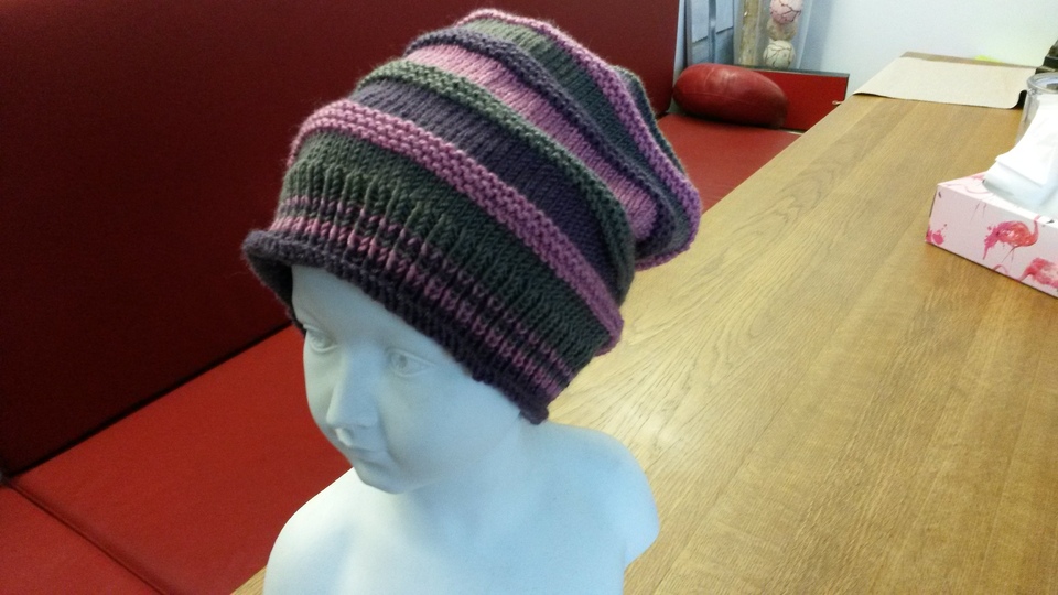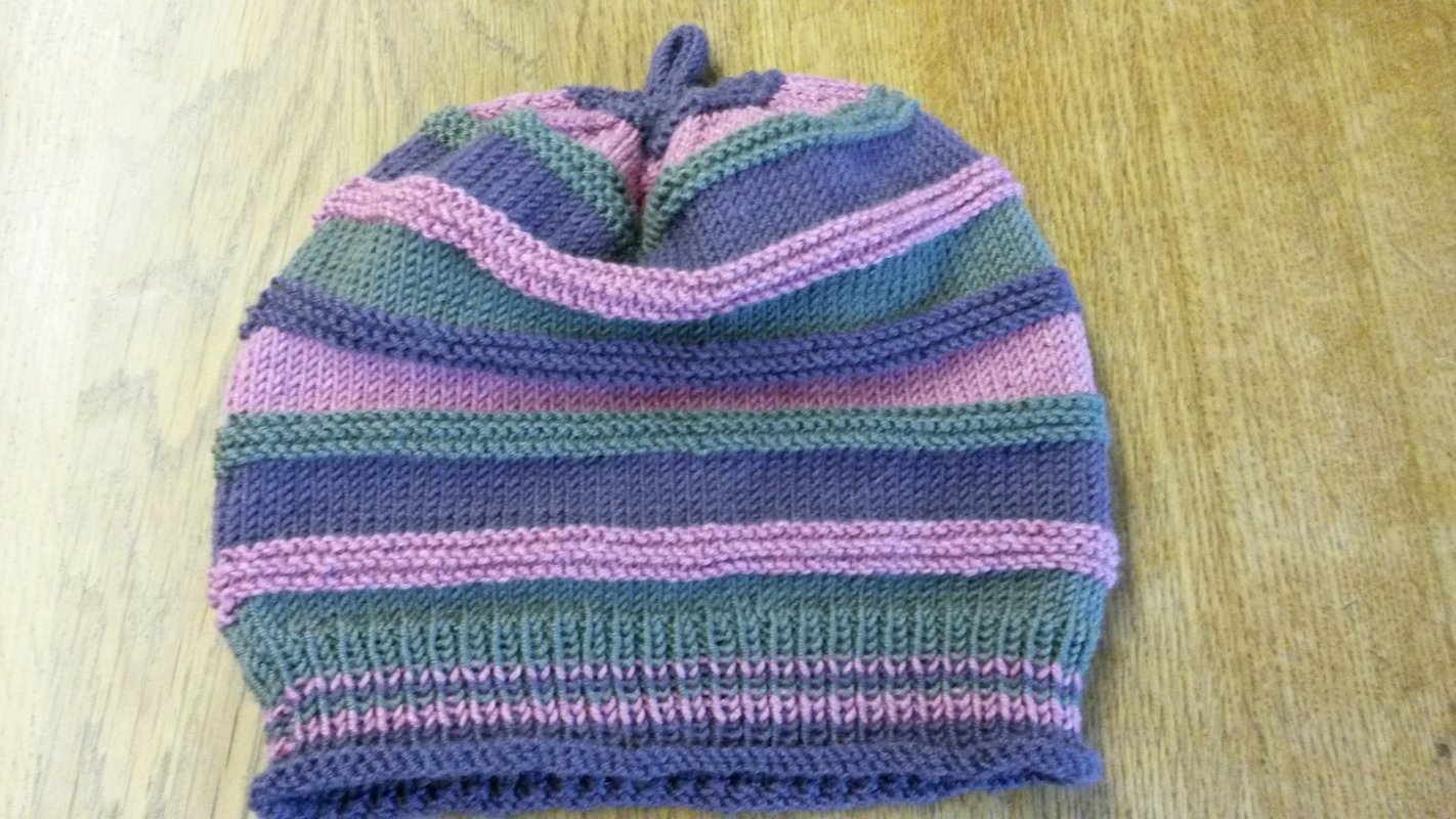 Die gestreifte Damenmütze ist einfach nachzustricken, der Mustermix besteht aus Bündchenmuster, einigen Reihen in Glatt rechts und einigen Reihen in Kraus rechts. Die Abnahmen zur Mützenspitze, ebenso das Stricken der Kordel-Lasche sind genau beschrieben.