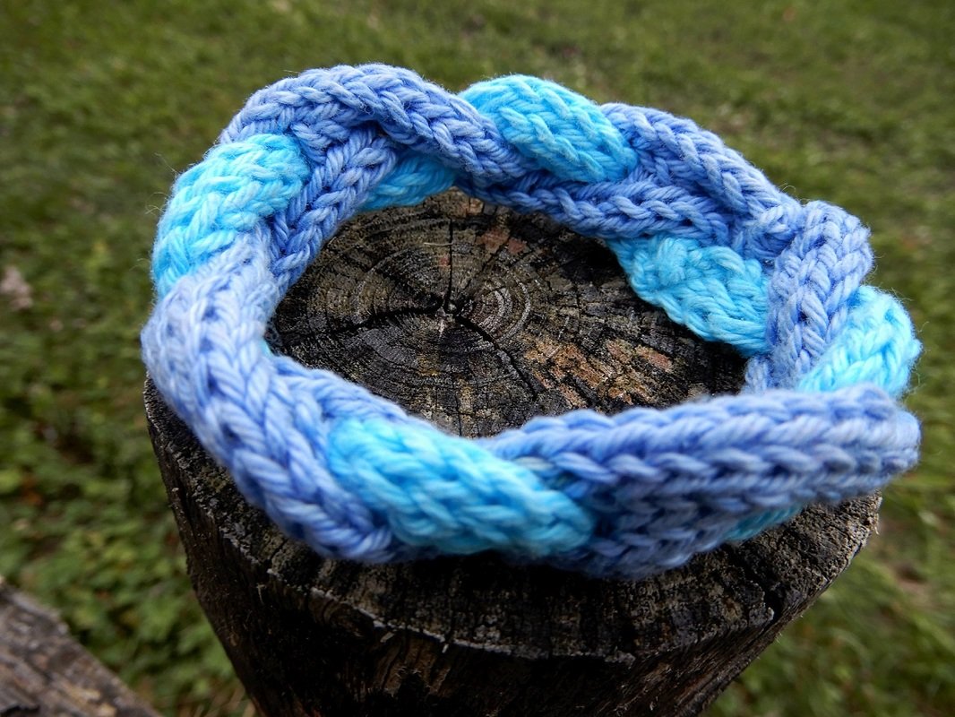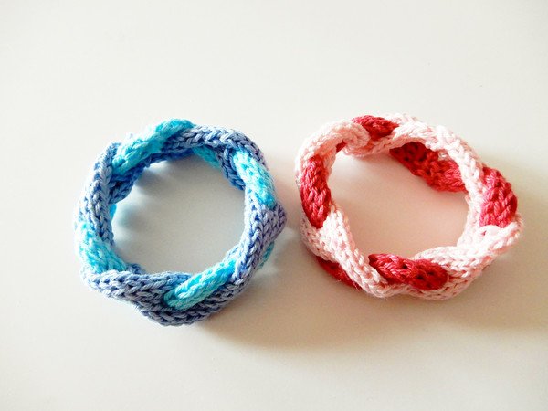 Yarn: Lana Grossa Cotone (100% cotton; 125m/50g; 137yds/1.76oz) in 2 different colors. A small leftover of each is enough. My samples used 10m (11yds) of main color and 7.5m (8yds) of contrast color.
