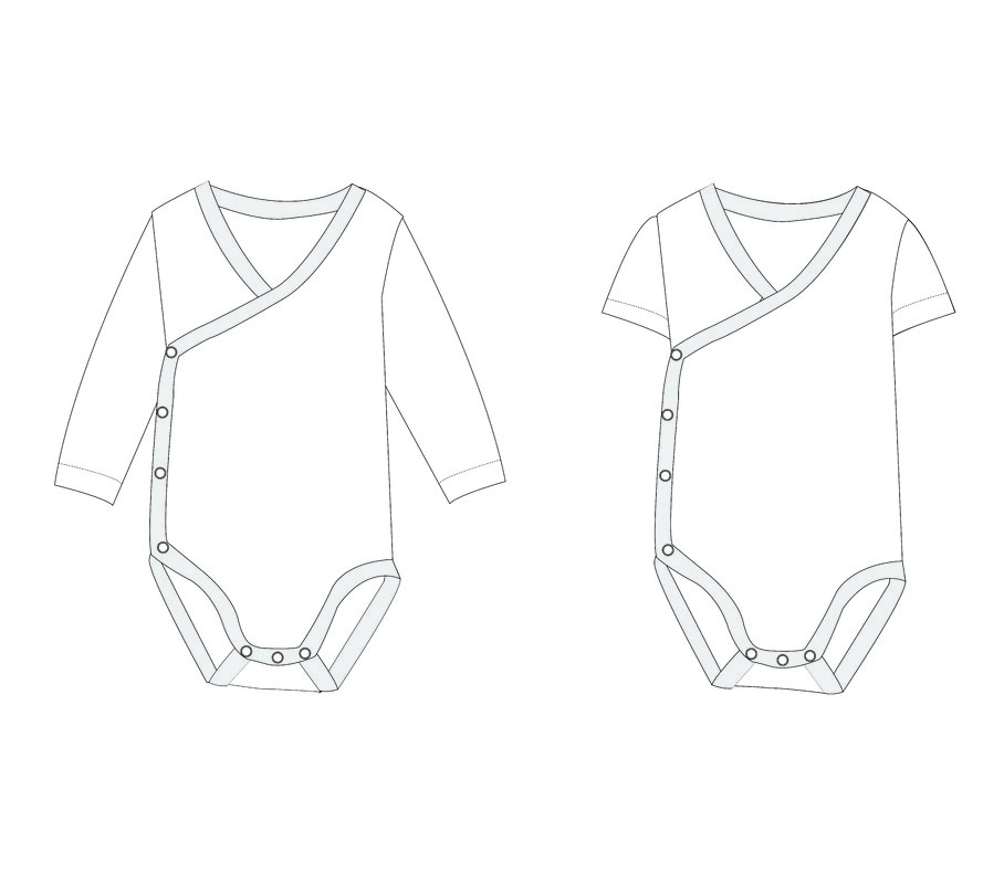With this digital 2-in-1 pattern you can sew a practical wrap bodysuit for babies: a long-sleeve version for cooler days and a short-sleeve version for warmer weather. The wrap design is perfect for easy dressing—no pulling over the head. A snap closure makes diaper changes quick and comfortable. Bonus patterns included: a teddy soft toy and a teething cloth.