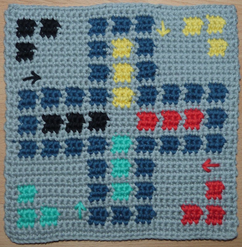 If you use cotton yarn with a yardage of 200y/3.5oz (90m/50g) and a hook size 3, the field will get a side length of approx. 18 cm.